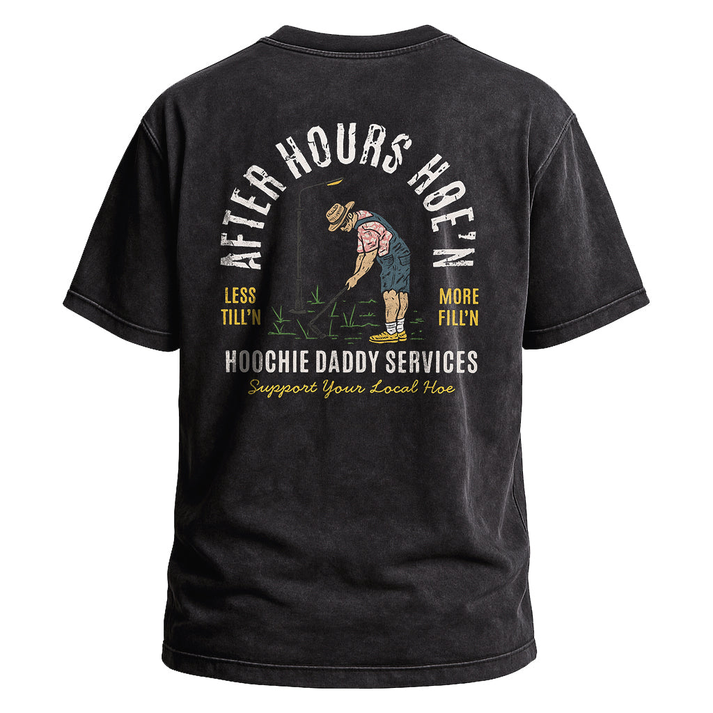 Celebrate the hardworking spirit with Bronven’s After Hours Hoem Tee. This washed brown shirt features a vintage-style back graphic of a man working in a field, surrounded by text reading “AFTER HOURS HOEM,” “HOOCHIE DADDY SERVICES,” and “Support Your Local Man.” Crafted from 100% cotton for comfortable wear and rugged charm.