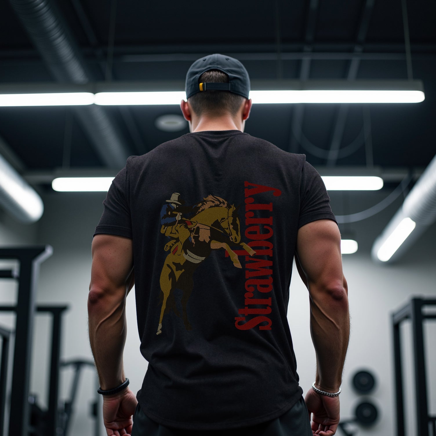 Celebrate rodeo action with Bronven’s Strawberry Bucking Bronco Tee. This washed brown shirt features a vibrant vintage-style back graphic of a cowboy riding a bucking bronco, paired with bold red vertical text reading “Strawberry.” Crafted from 100% cotton for comfortable wear and rugged Western style.