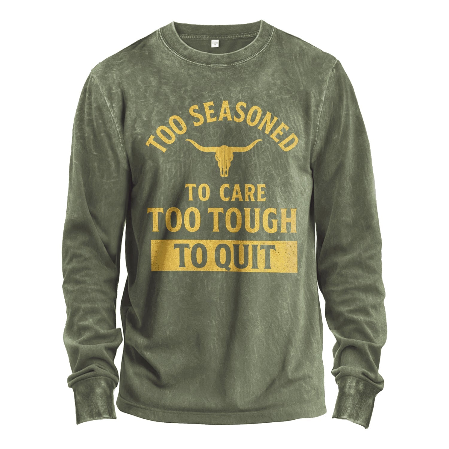 Vintage-washed military olive body with bold, distressed golden typography: “TOO SEASONED TO CARE” arched above a longhorn skull, and a block badge reading “TOO TOUGH TO QUIT.”
