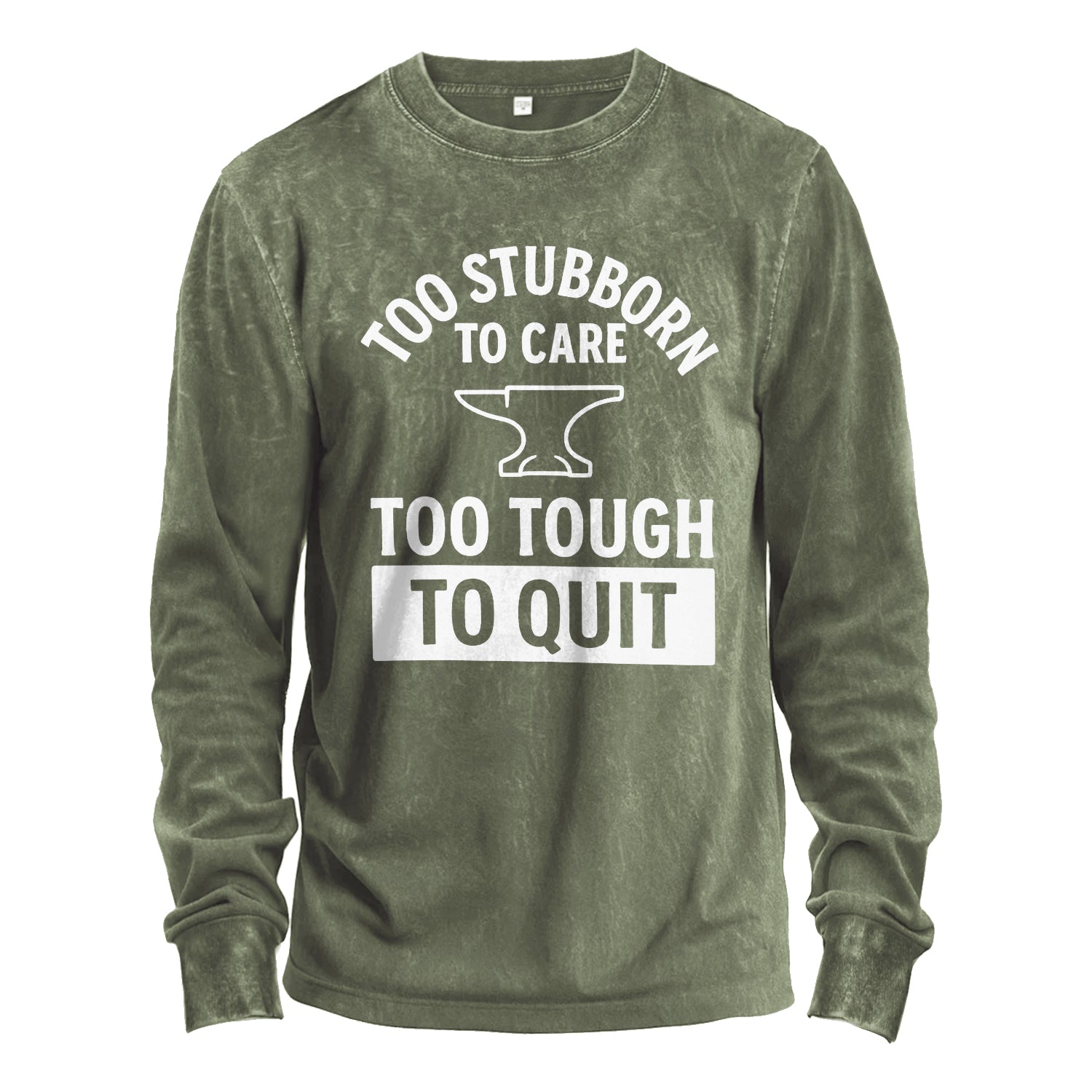 Vintage-washed military olive body with bold, distressed white typography: an arched “TOO STUBBORN TO CARE” above a clean anvil icon, finished with a block badge reading “TOO TOUGH TO QUIT.”